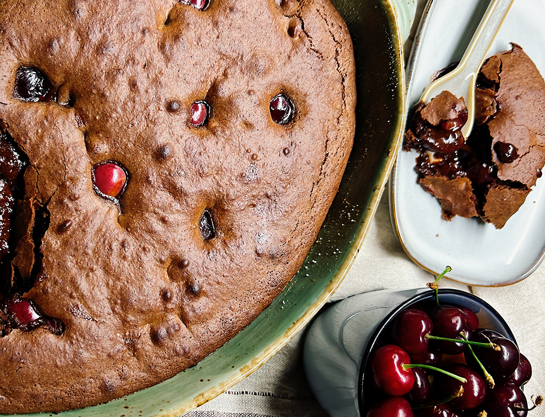 Κέικ σουφλέ με κεράσια, ένα απολαυστικό επιδόρπιο που συνδυάζει την ελαφρότητα του σουφλέ με την πλούσια γεύση των κερασιών. Ιδανικό για καλοκαιρινές βραδιές.